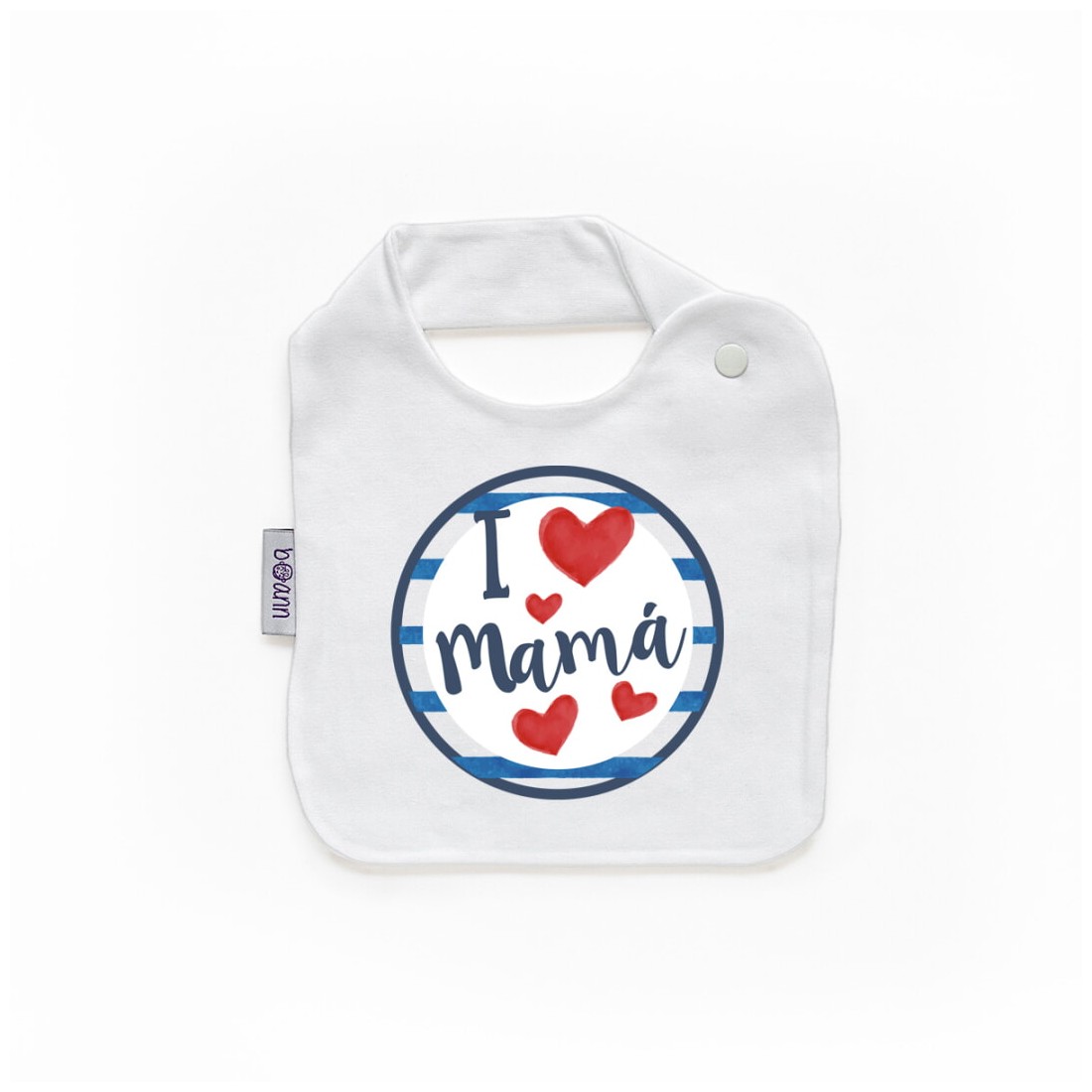 Bavaglino personalizzato con la scritta "Io ❤️ mamma"emoji">❤️ Mamma", realizzato con 3 strati di morbido cotone.