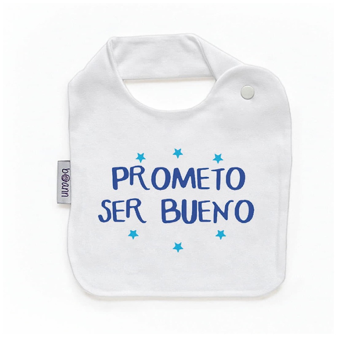 Bavaglino personalizzato con la frase "PROMO DI ESSERE BUONO", realizzato con 3 morbidi strati di cotone.