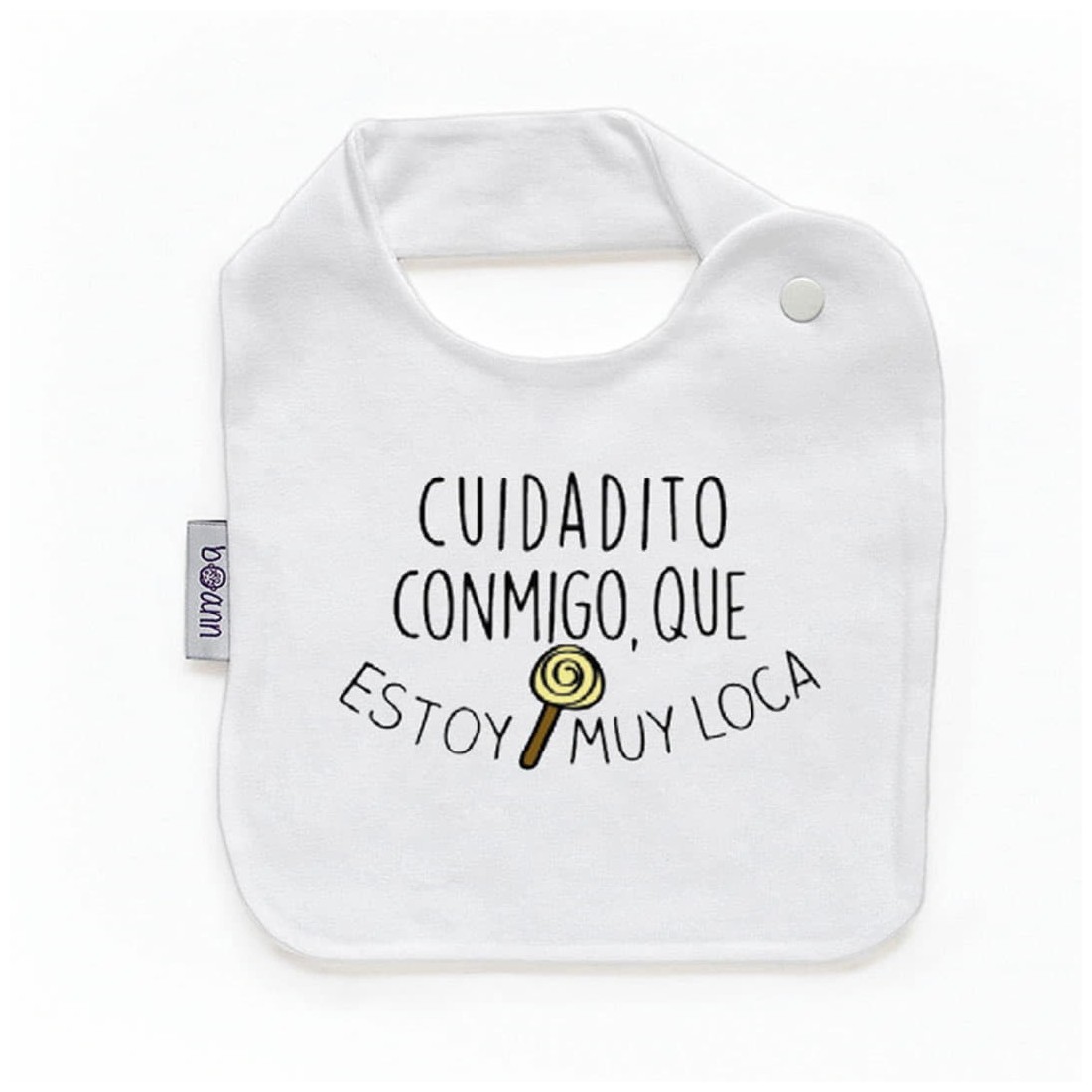 Bavaglino personalizzato con la scritta "STAI ATTENTO CON ME, SONO UNA RAGAZZA PAZZA", realizzato con 3 strati di morbido cotone.