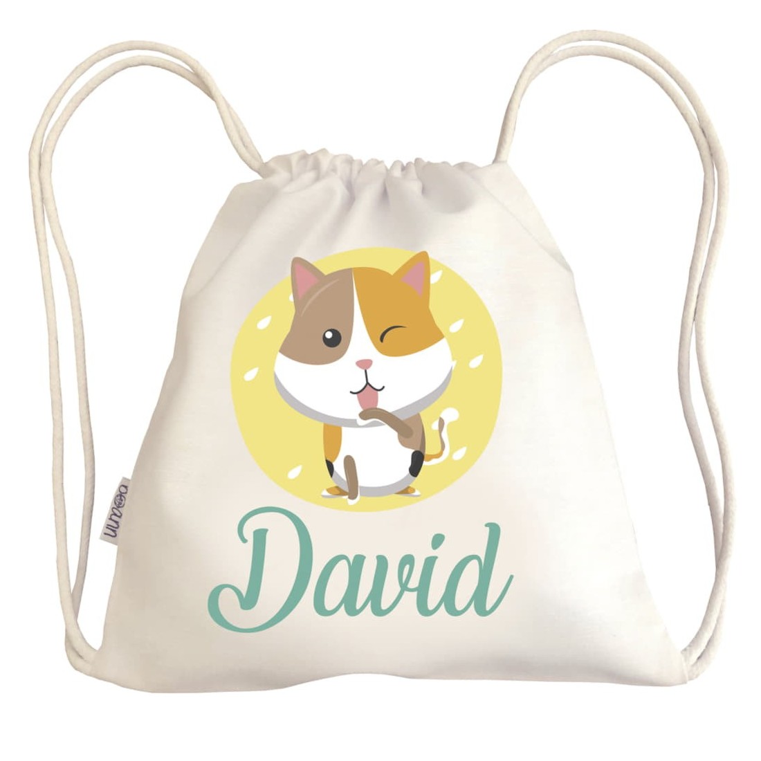 Borsa personalizzata con manici con il nome che più ti piace e un disegno del Gatto, disponibile in bianco e con una dimensione di 28x30cm.