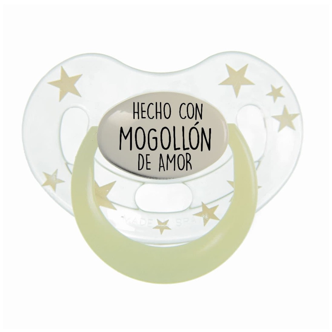 Ciuccio personalizzato con la scritta "FATTO CON TANTO AMORE", disponibile con tendina anatomica in lattice o silicone nelle taglie piccola (0-6 mesi) e grande (6-36 mesi)