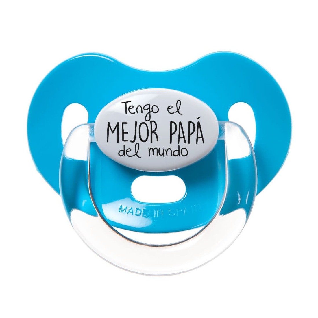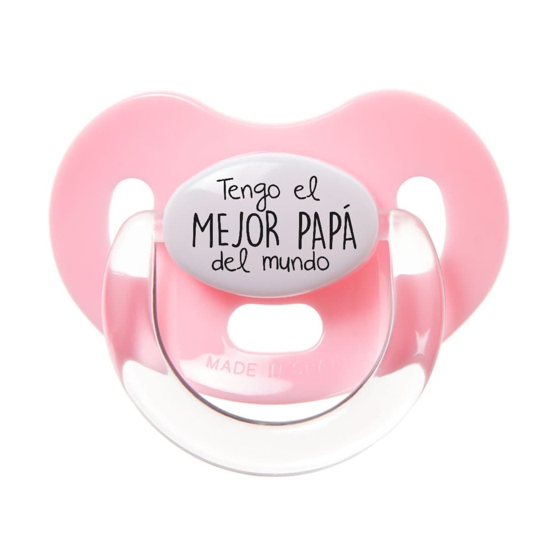 Ciuccio personalizzato con la scritta "Ho il MIGLIOR PAPÀ del mondo", disponibile con la tettarella anatomica in lattice o silicone nelle taglie piccola (0-6 mesi) e grande (6-36 mesi).