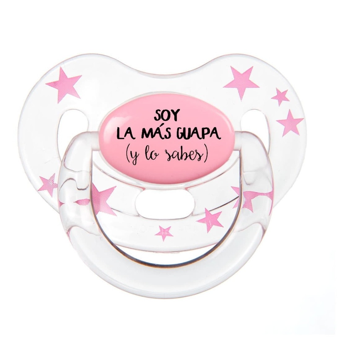 Ciuccio personalizzato con la frase "IO SONO LA PIÙ BELLA (e tu lo sai)", disponibile con la tettarella anatomica in lattice o silicone nelle taglie piccola (0-6 mesi) e grande (6-36 mesi)