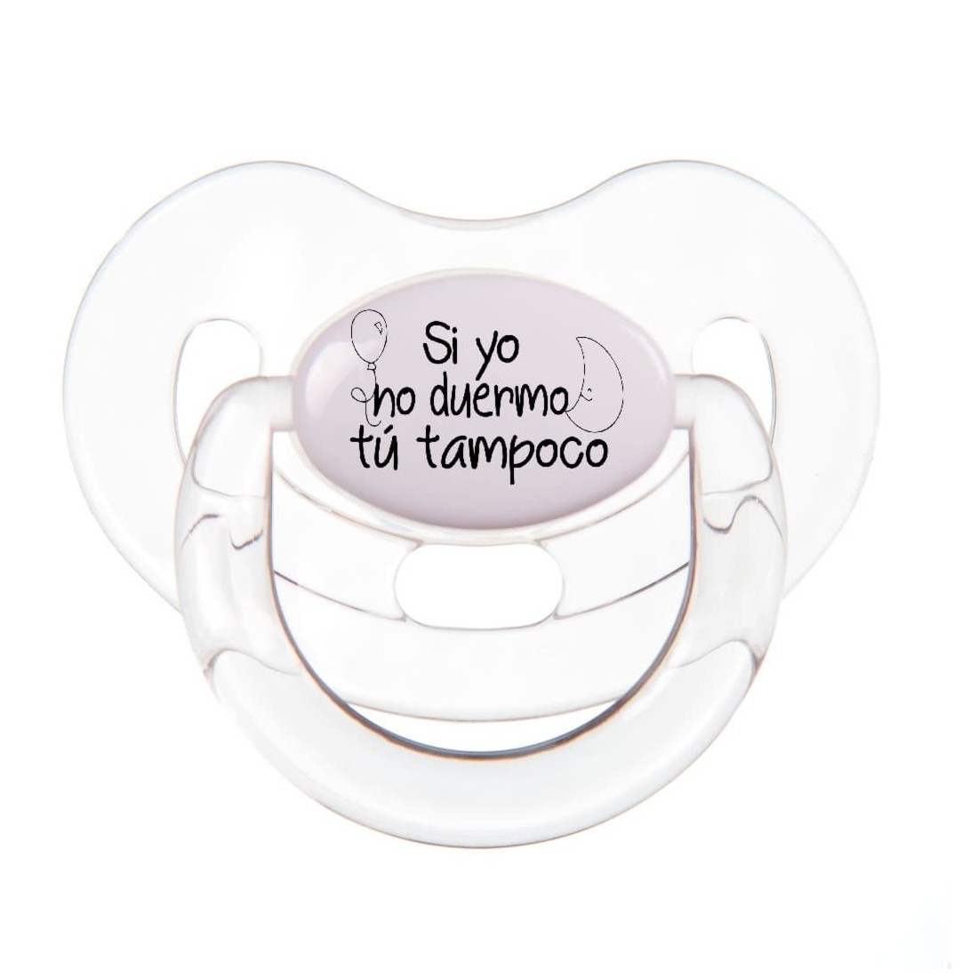 Ciuccio personalizzato con la frase "Se non dormo, nemmeno tu.", disponibile con la tenda anatomica in lattice o silicone nelle taglie piccola (0-6 mesi) e grande (6-36 mesi).
