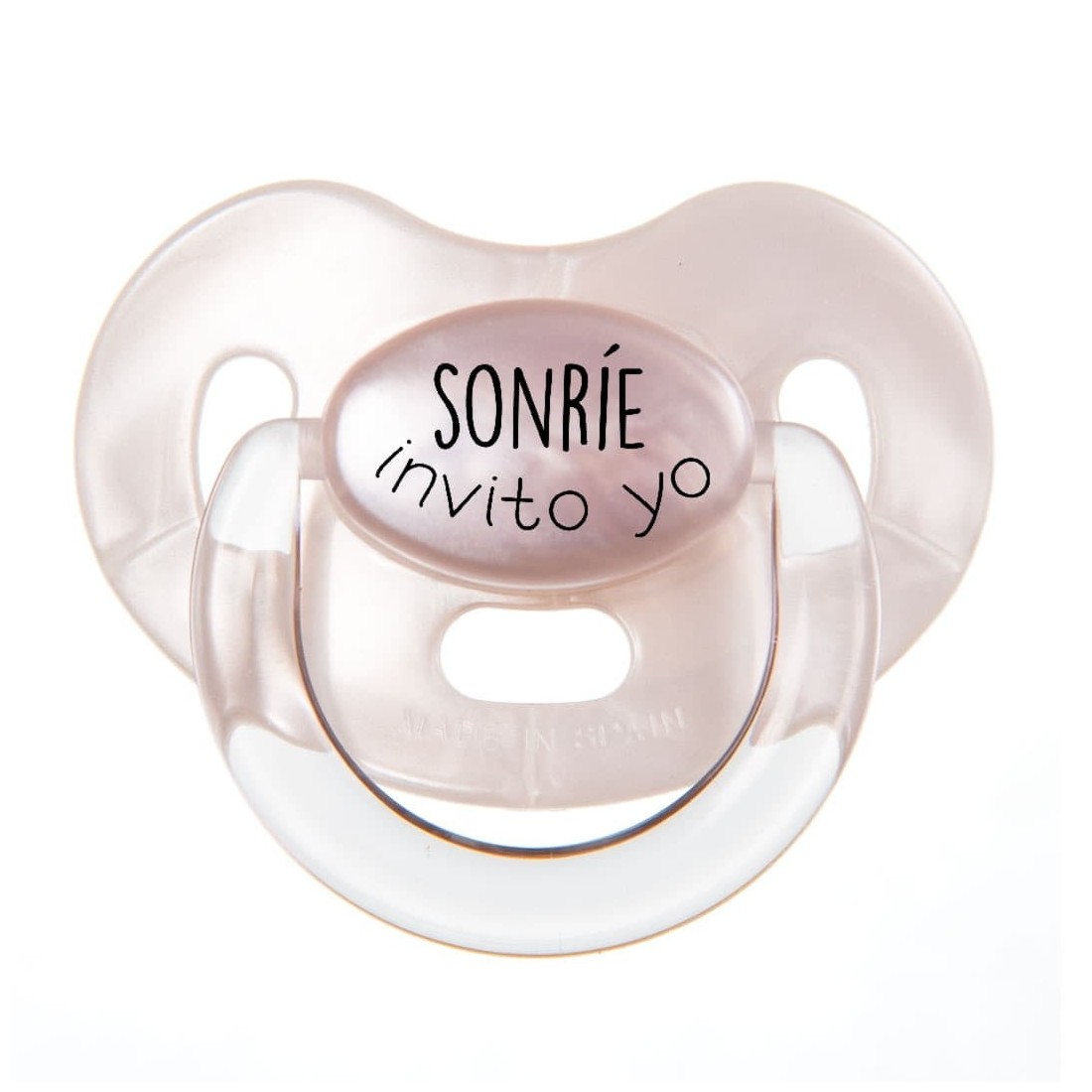 Ciuccio personalizzato con la scritta "SORRISO Invito", disponibile con la tettarella anatomica in lattice o silicone nelle taglie piccola (0-6 mesi) e grande (6-36 mesi)