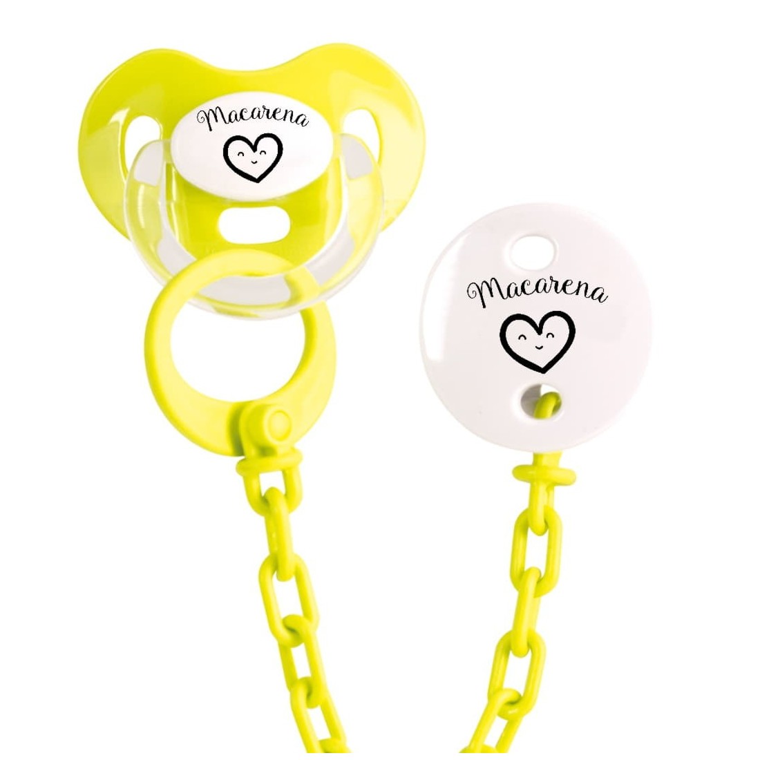 Set Ciuccio e Catena con Cuore e personalizzato con un nome, il ciuccio è disponibile nelle taglie piccola (0-6 mesi) o grande (6-36 mesi) e con capezzoli in silicone o lattice.