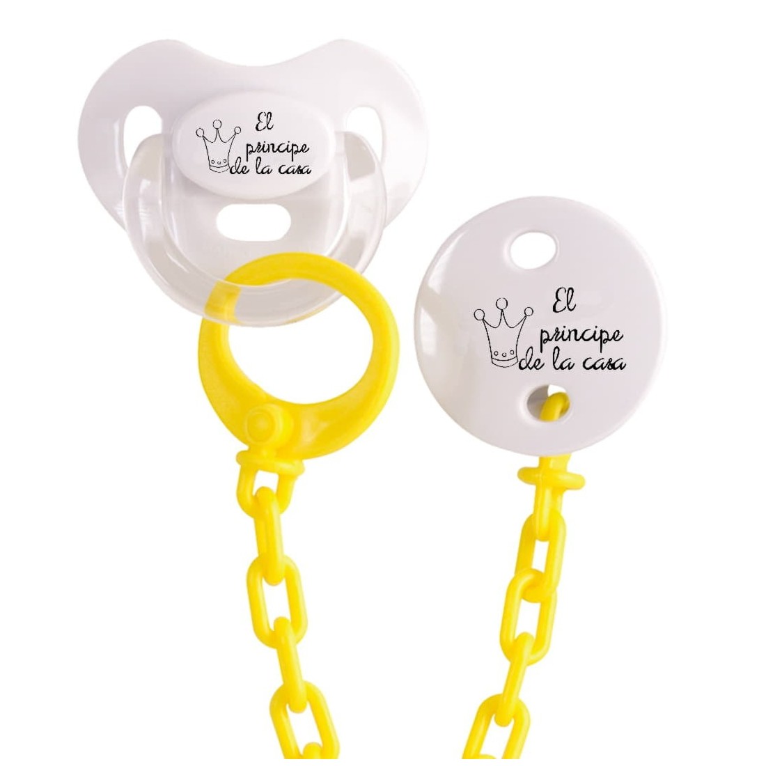 Set ciuccio e catenella personalizzato con la frase "Il principe di casa", il ciuccio è disponibile nelle taglie small (0-6 mesi) o large (6-36 mesi) e con capezzoli in silicone o lattice.