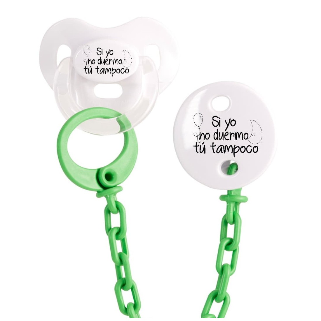 Set ciuccio e catenella personalizzati con la frase "Se non dormo, nemmeno tu.", il ciuccio è disponibile nelle taglie piccola (0-6 mesi) o grande (6-36 mesi) e con capezzoli in silicone o lattice .