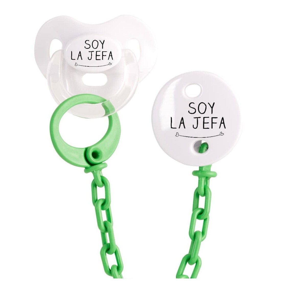 Set ciuccio e catenella personalizzato con la frase "SONO IL CAPO", il ciuccio è disponibile nelle taglie small (0-6 mesi) o large (6-36 mesi) e con capezzoli in silicone o lattice.