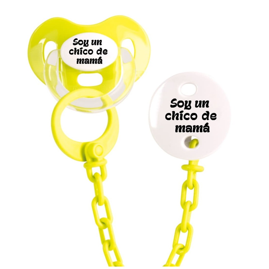 Set ciuccio e catenella personalizzato con la frase "Sono il figlio di una mamma", il ciuccio è disponibile nelle taglie small (0-6 mesi) o large (6-36 mesi) e con capezzoli in silicone o lattice.