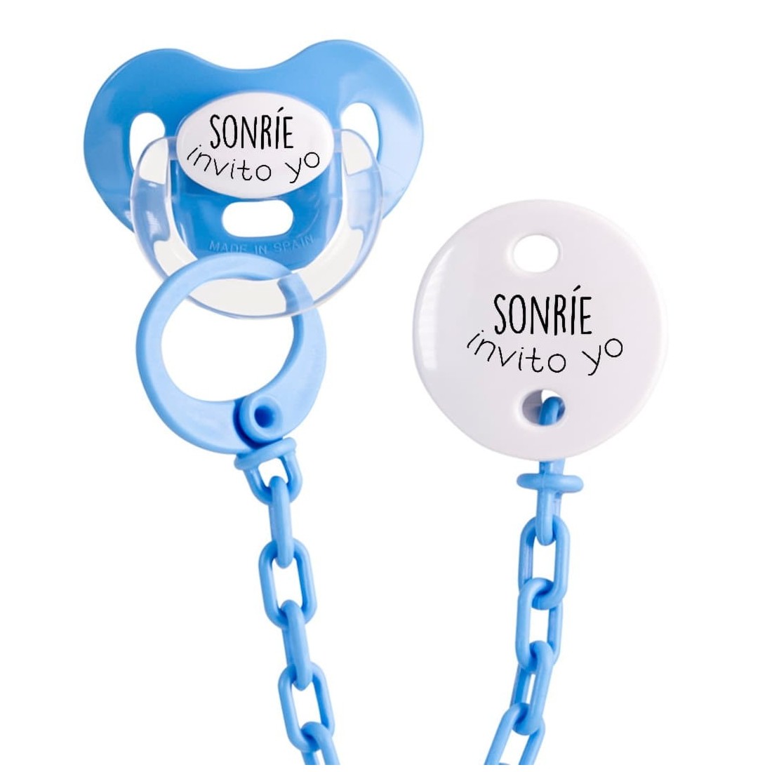 Set ciuccio e catenella personalizzati con la scritta "SORRISO Invito", il ciuccio è disponibile nelle taglie small (0-6 mesi) o large (6-36 mesi) e con capezzoli in silicone o lattice.