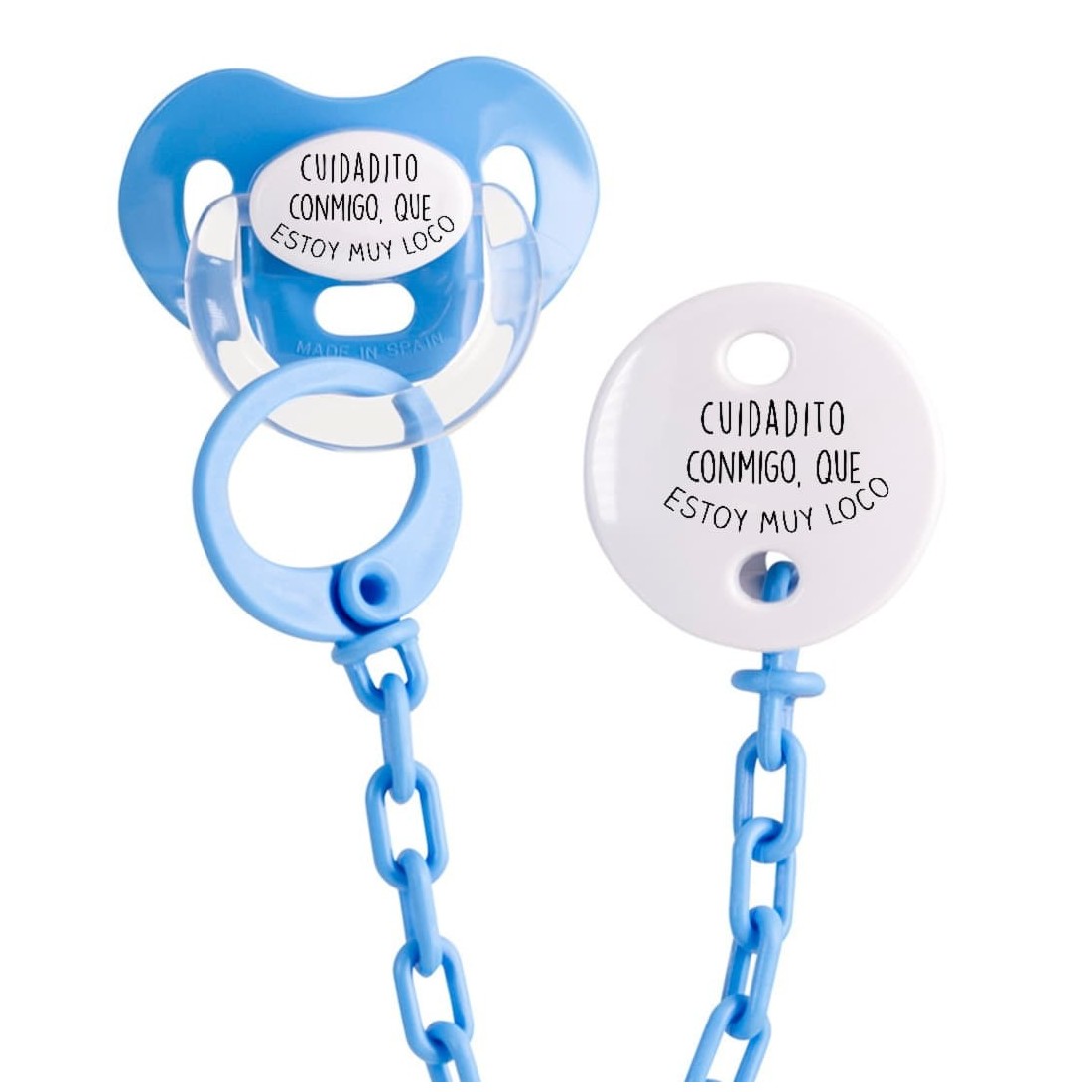 Set ciuccio e catenella personalizzato con la scritta "STAI ATTENTO CON ME, SONO MOLTO PAZZO", il ciuccio è disponibile nelle taglie piccola (0-6 mesi) o grande (6-36 mesi) e con capezzoli in silicone o lattice.
