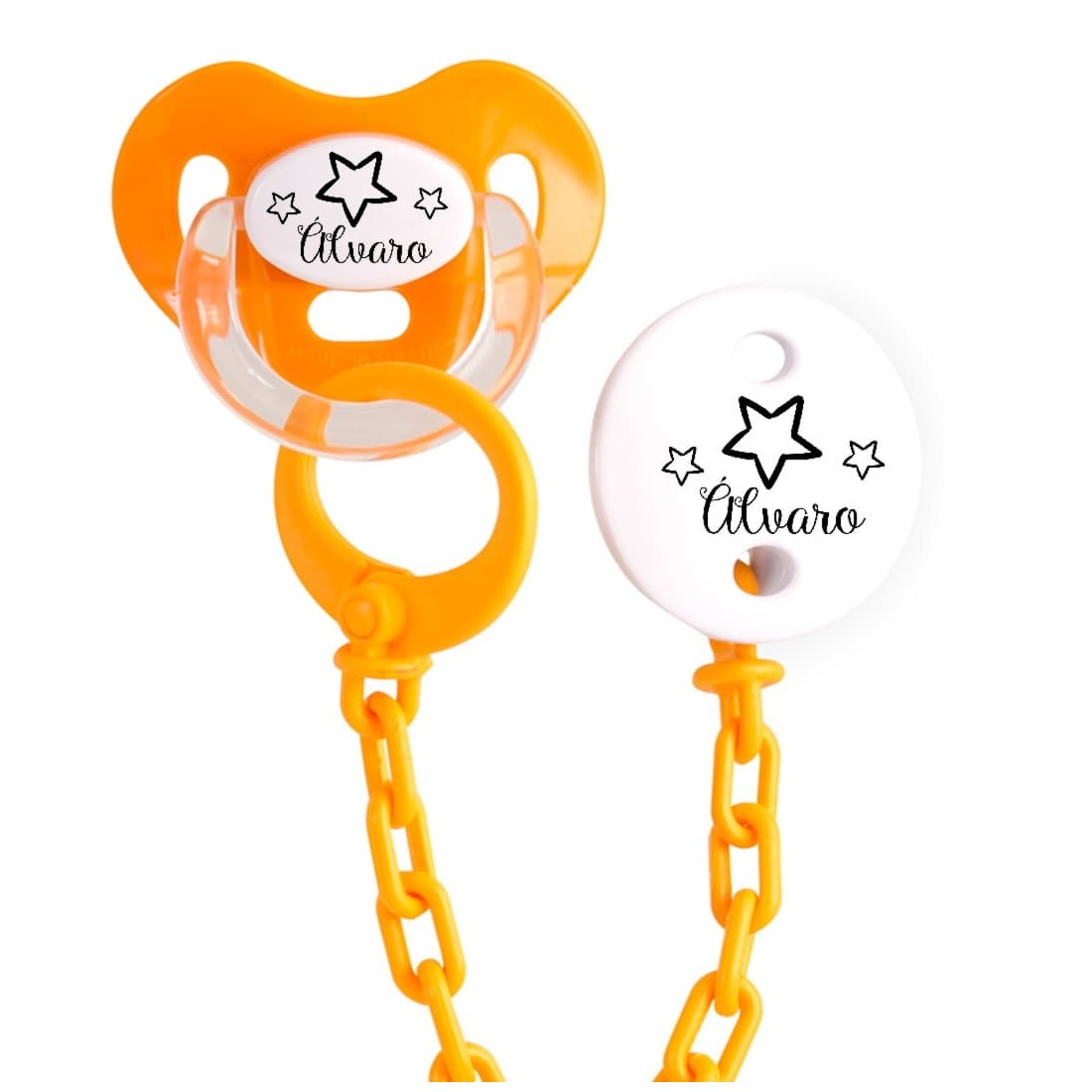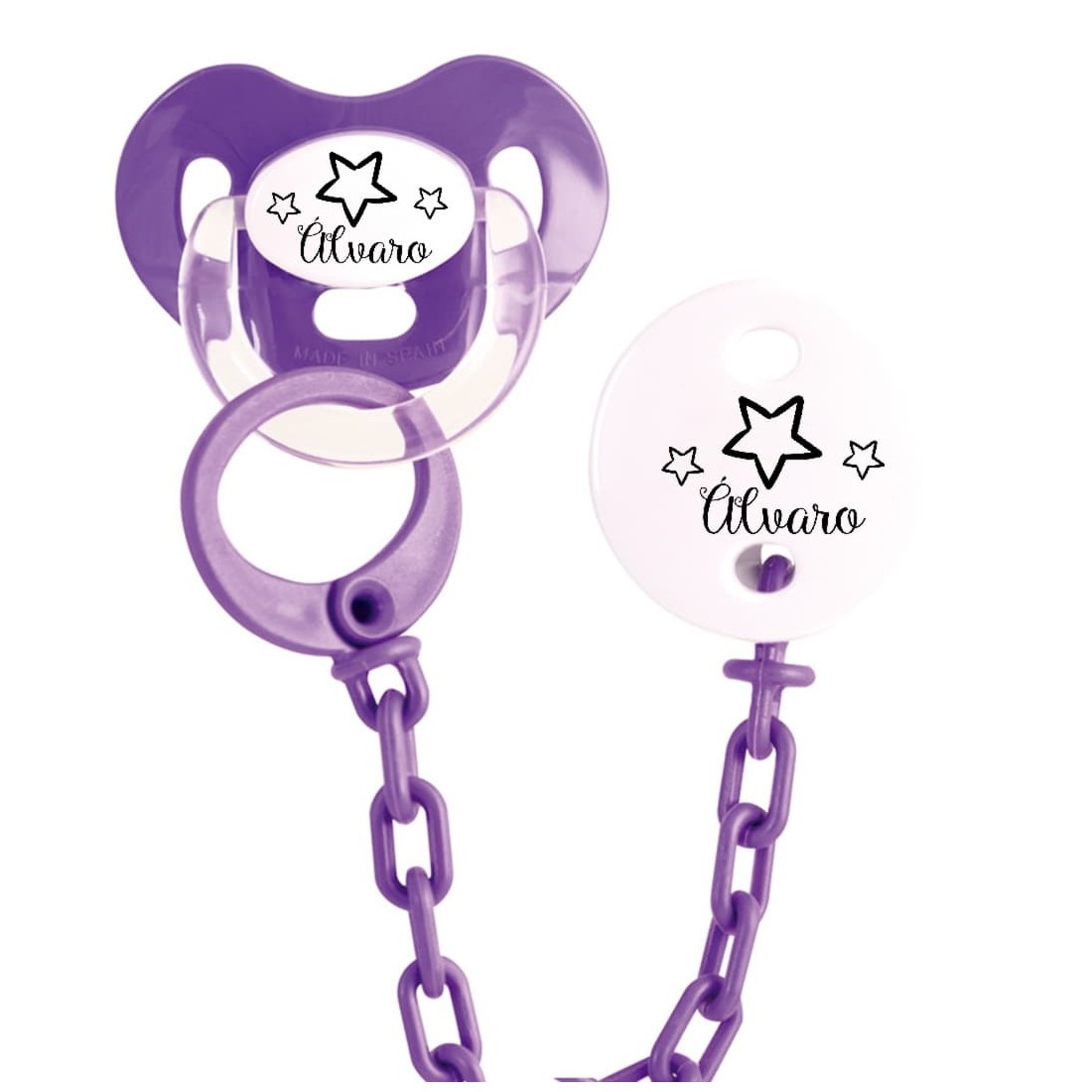 Set Ciuccio e Catena con Stella e personalizzato con un nome, il ciuccio è disponibile nelle taglie piccola (0-6 mesi) o grande (6-36 mesi) e con capezzoli in silicone o lattice.
