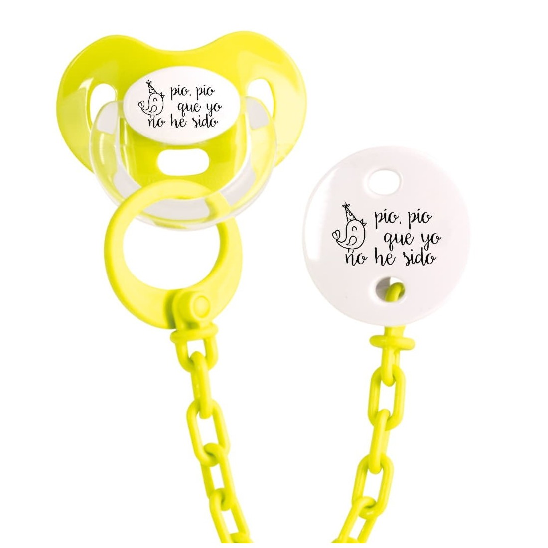 Set ciuccio e catenella personalizzato con la frase "Tweet, tweet che non sono stato", il ciuccio è disponibile nelle taglie small (0-6 mesi) o large (6-36 mesi) e con capezzoli in silicone o lattice.