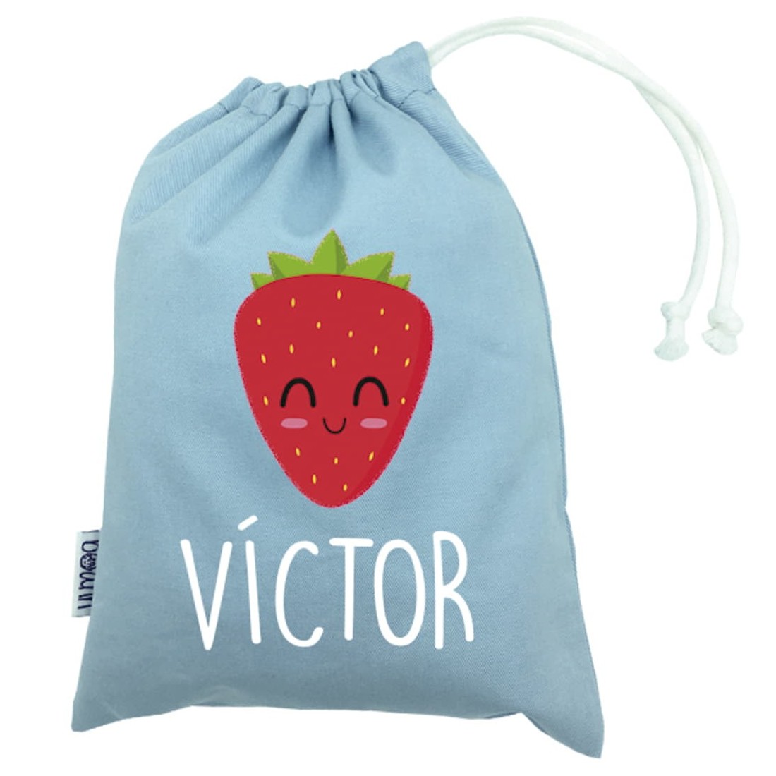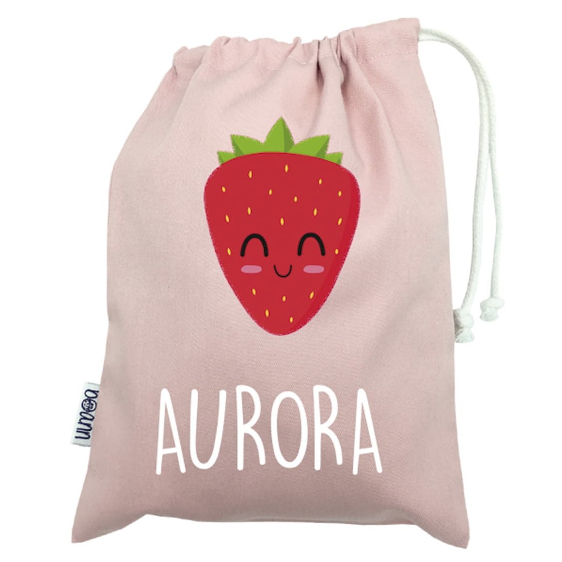 Mini Bag personalizzata con il nome che più ti piace e un disegno Fragola, disponibile in rosa e blu e con una dimensione di 27,5x21,5 cm.