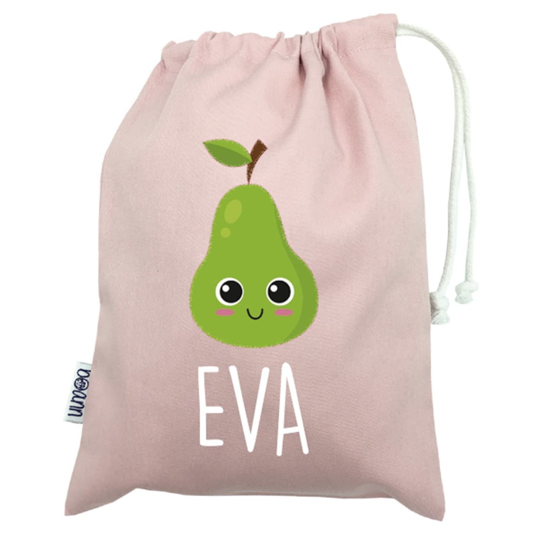 Mini Bag personalizzata con il nome che più ti piace e un disegno di Pera, disponibile in rosa e blu e con una dimensione di 27,5x21,5cm.