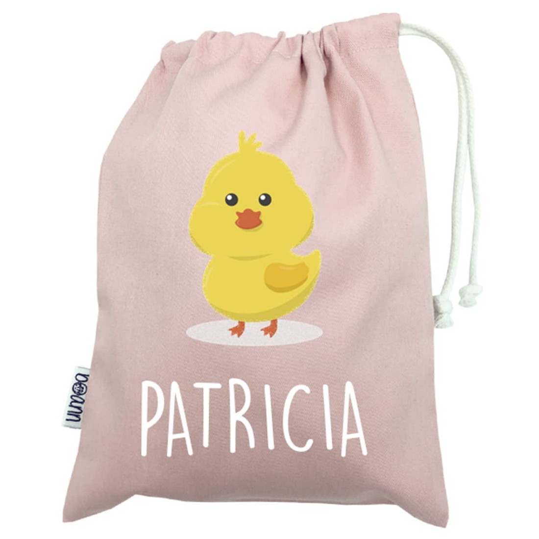 Mini Bag personalizzata con il nome che più ti piace e il disegno del pollo, disponibile in rosa e blu e con una dimensione di 27,5x21,5 cm.