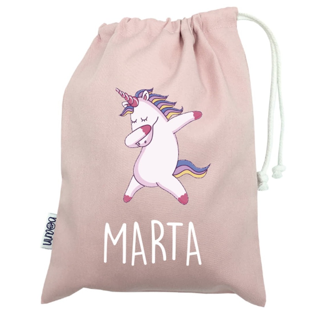 Mini Bag personalizzata con il nome che più ti piace e un disegno di Unicorno, disponibile in rosa e blu e con una dimensione di 27,5x21,5cm.