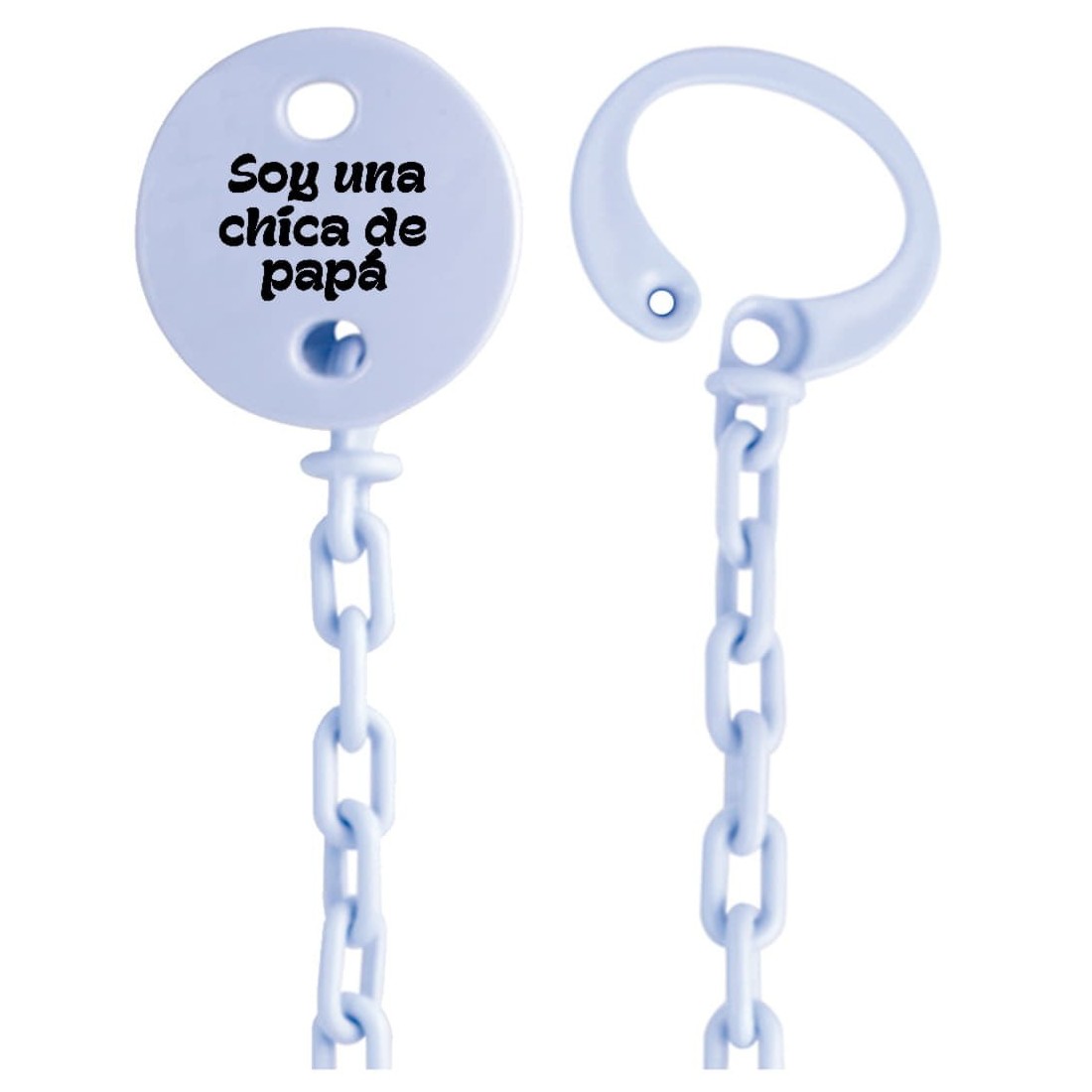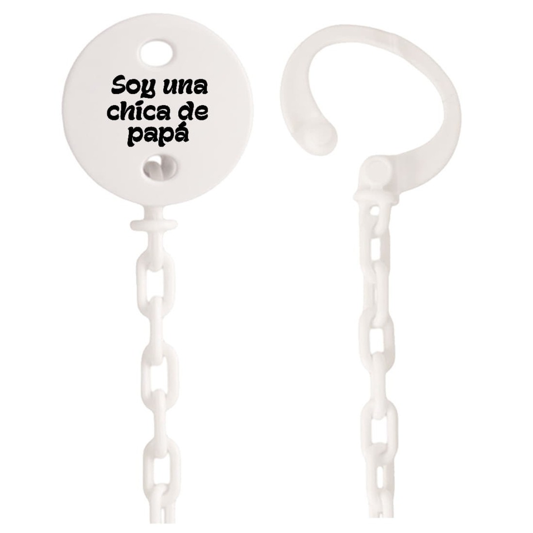 Catena porta ciuccio personalizzata con la frase "Sono la ragazza di papà", si adatta a qualsiasi ciuccio con anello.