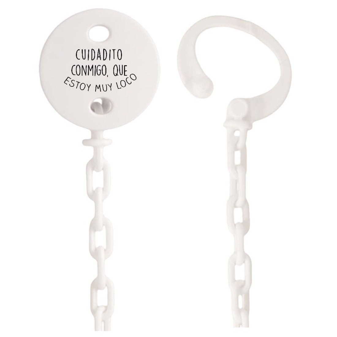 Catena Porta Ciuccio Personalizzata con la scritta "STAI ATTENTO CON ME, SONO MOLTO PAZZO", si adatta a qualsiasi ciuccio con anello.
