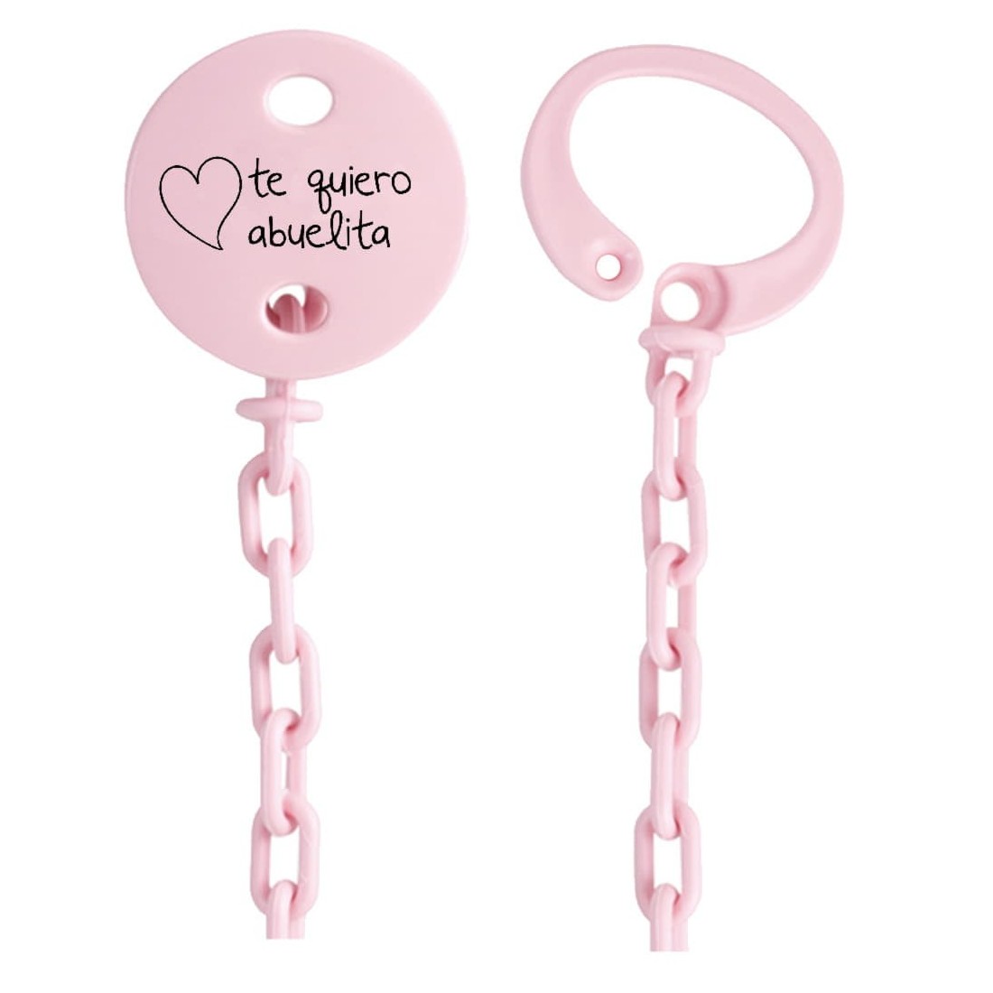 Catena Porta Ciuccio personalizzata con la frase "Ti amo nonna", si adatta a qualsiasi ciuccio con anello.