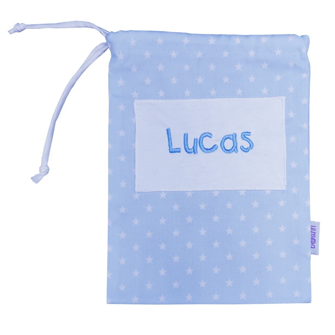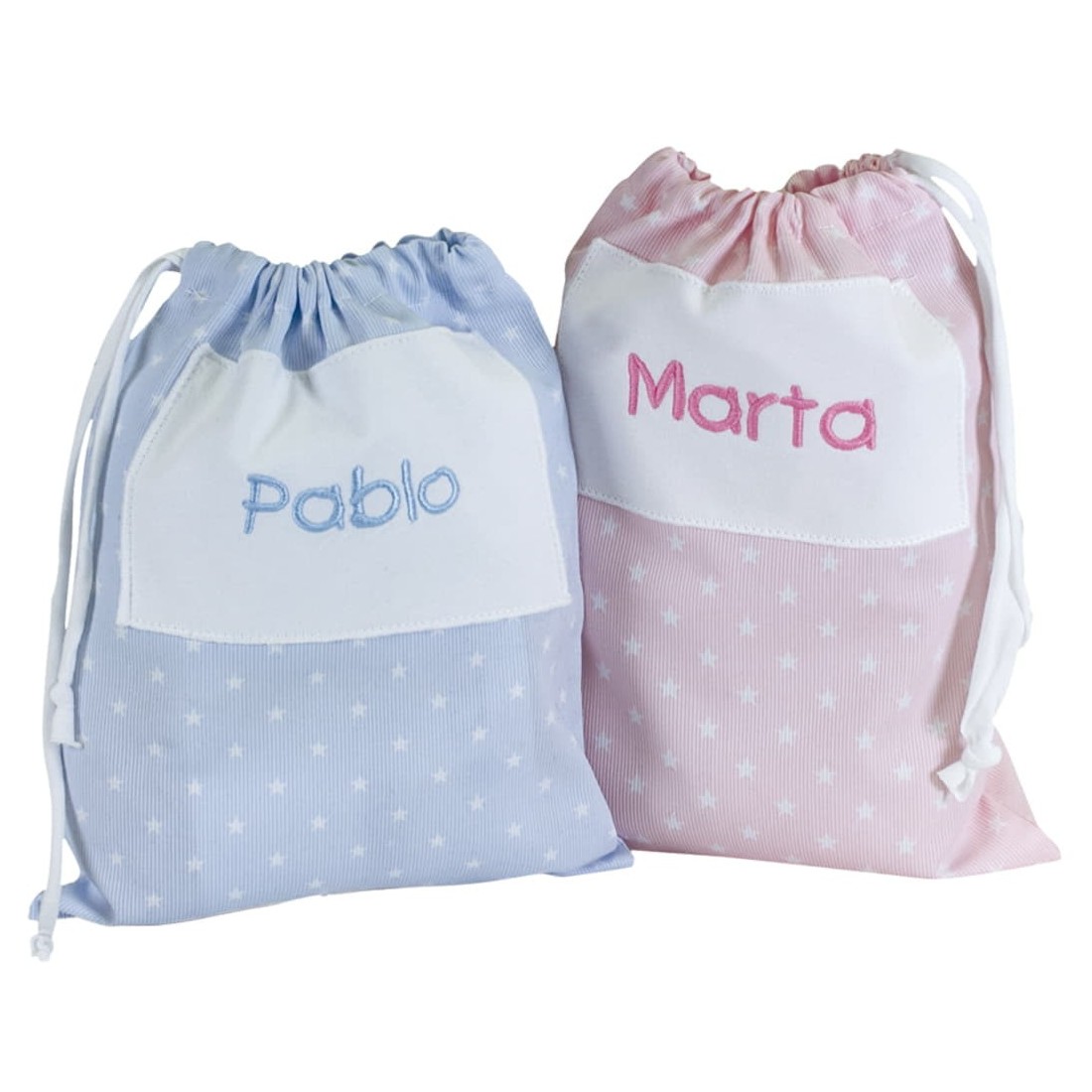 Borsa snack con disegno Stelle con il nome che ti piace ricamato, disponibile in rosa e blu.