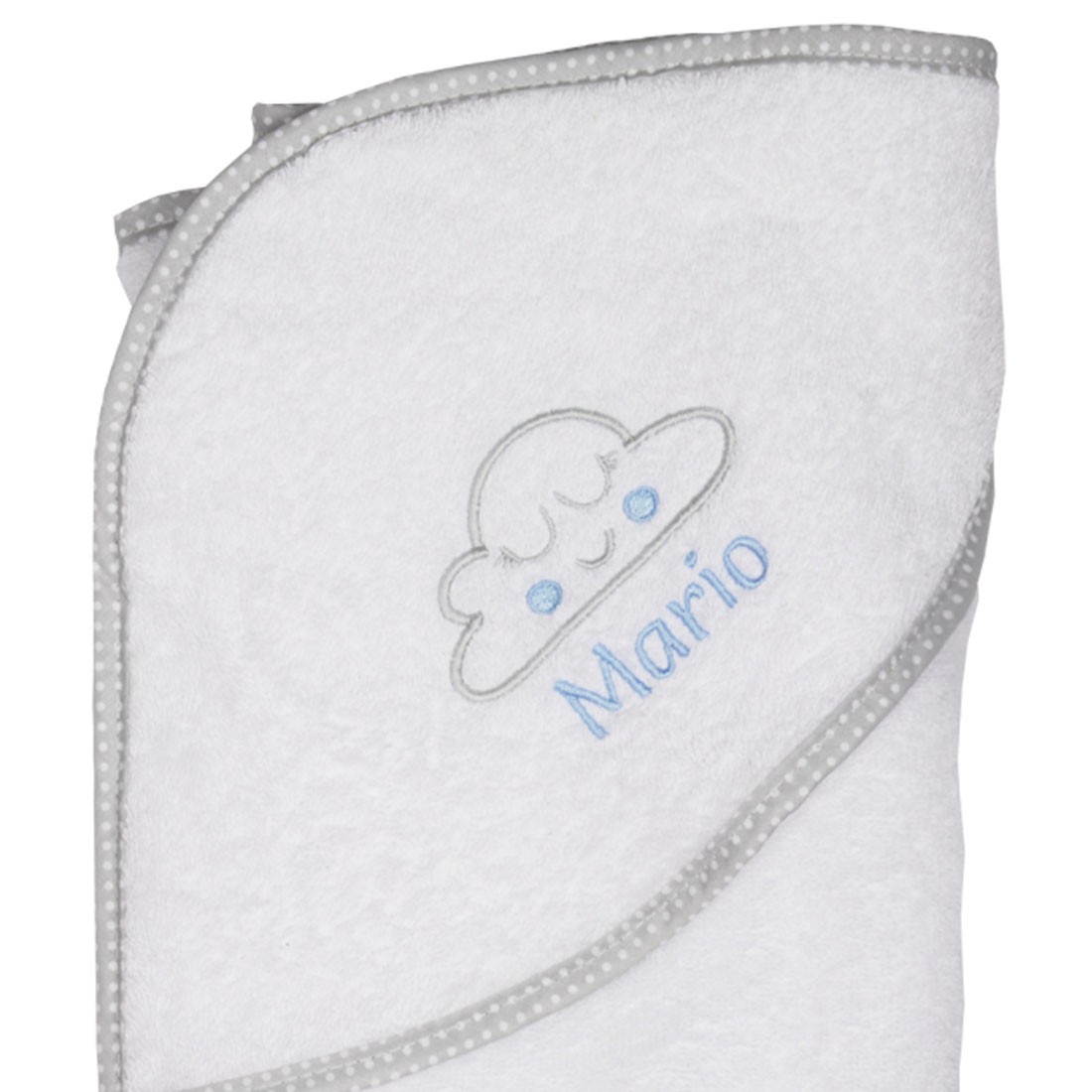 Mantella da bagno in cotone 100% che misura 100cm x 100cm con un bel disegno Cloud con Blush a cui puoi aggiungere un ricamo in Blu con il nome che desideri.