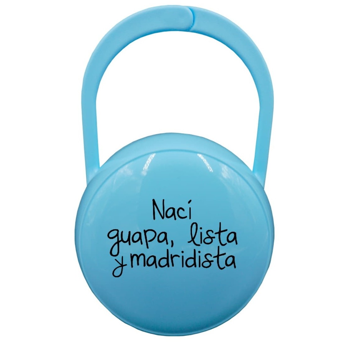 Scatola per riporre il ciuccio personalizzato con la frase "Sono nata carina, intelligente e madridista", è valido per tutti i nostri ciucci.