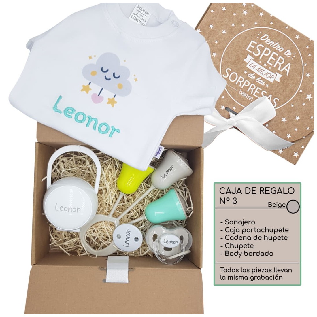 Confezione composta da Ciuccio, Catena, Sonaglio, Scatola Porta Ciuccio e Body Ricamato in beige personalizzato con un nome; il tutto racchiuso in una scatola ideale da regalare. Tutti i pezzi portano la stessa registrazione.