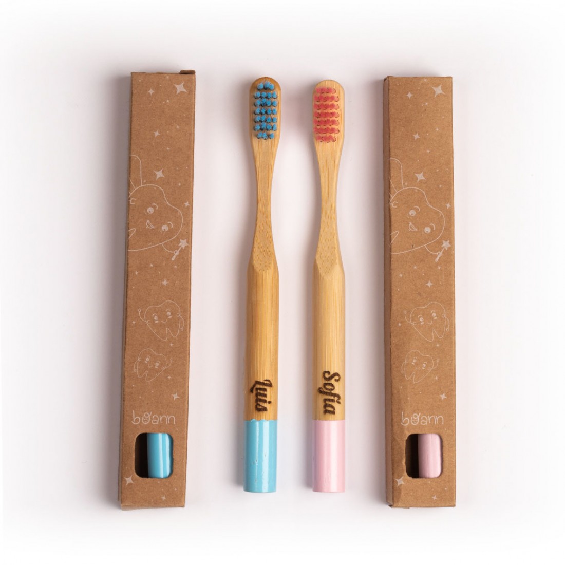 Spazzolino per bambini in bambù personalizzato con un nome, pensato per l'igiene del bambino. Disponibile con setole blu o rosa.