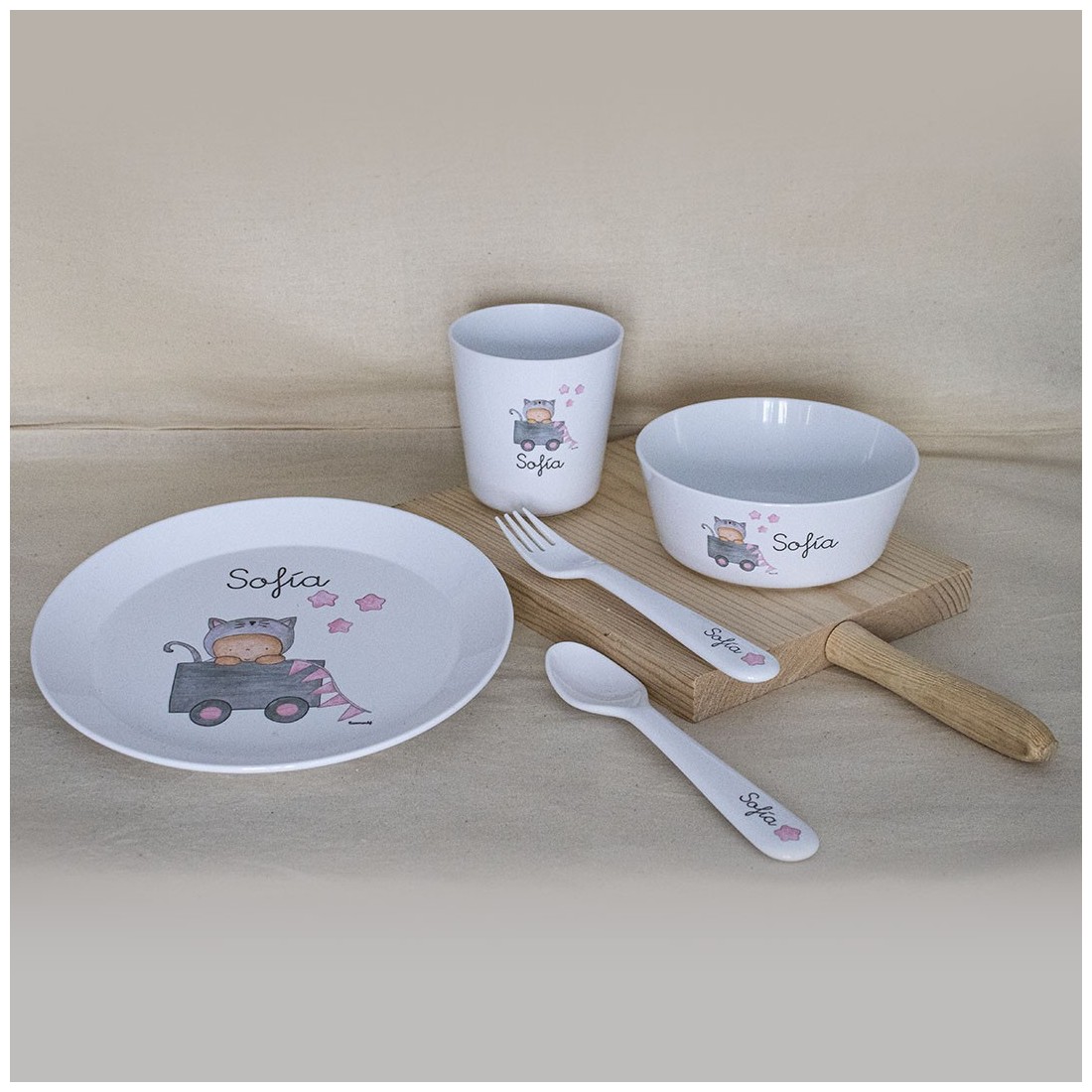 Stoviglie complete (Piatti + Bicchiere + Posate) Giocattoli Rosa Con Nome Personalizzato