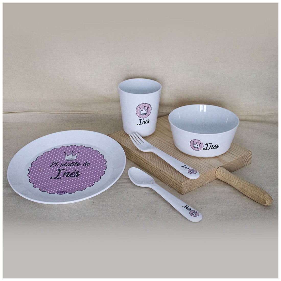Le Stoviglie Complete sono un regalo con un design divertente per i più piccoli per iniziare la loro autonomia a tavola ed è composto da 5 pezzi: piatto, ciotola, bicchiere, cucchiaio e forchetta. Tutti i prodotti possono essere personalizzati con il nome o la frase che si desidera.