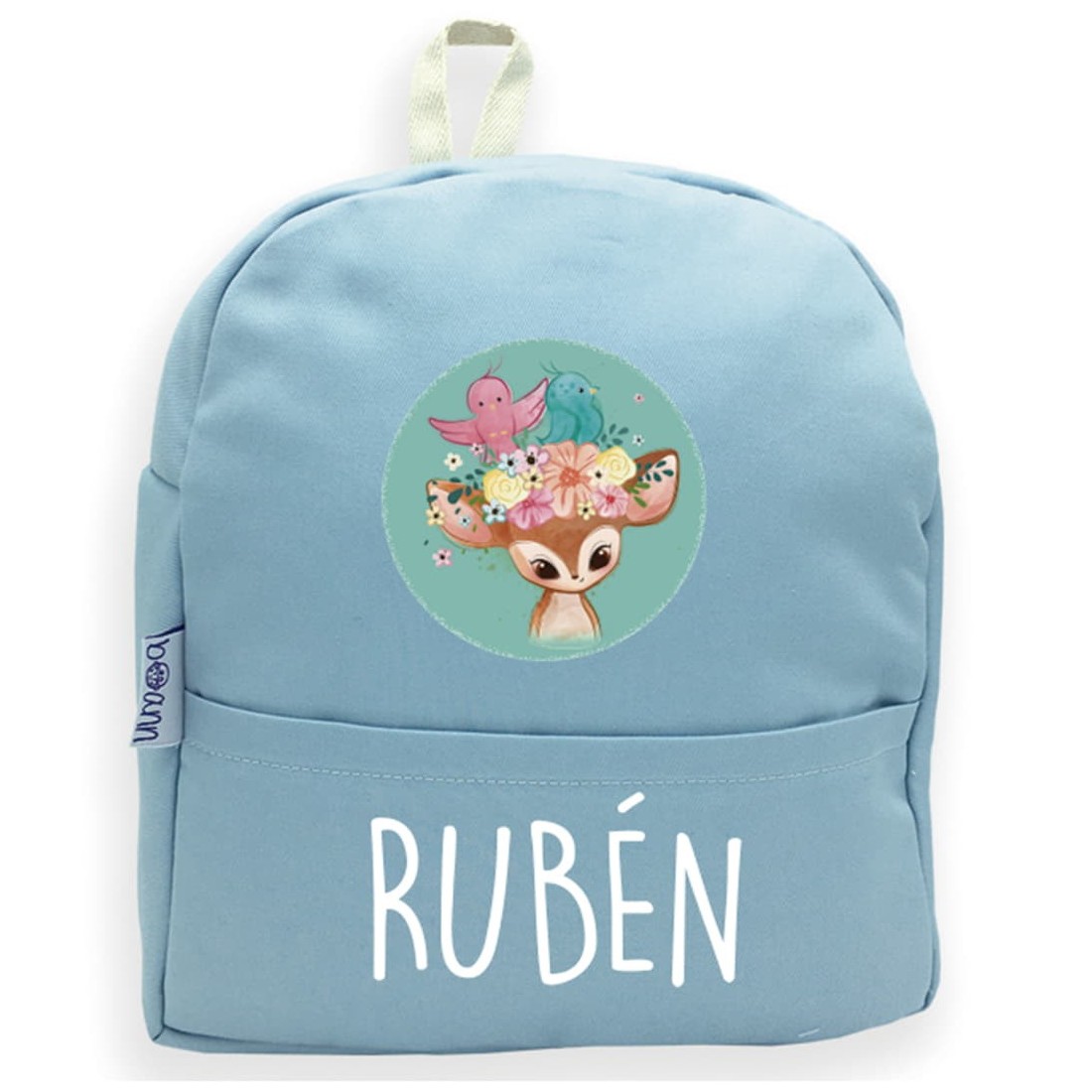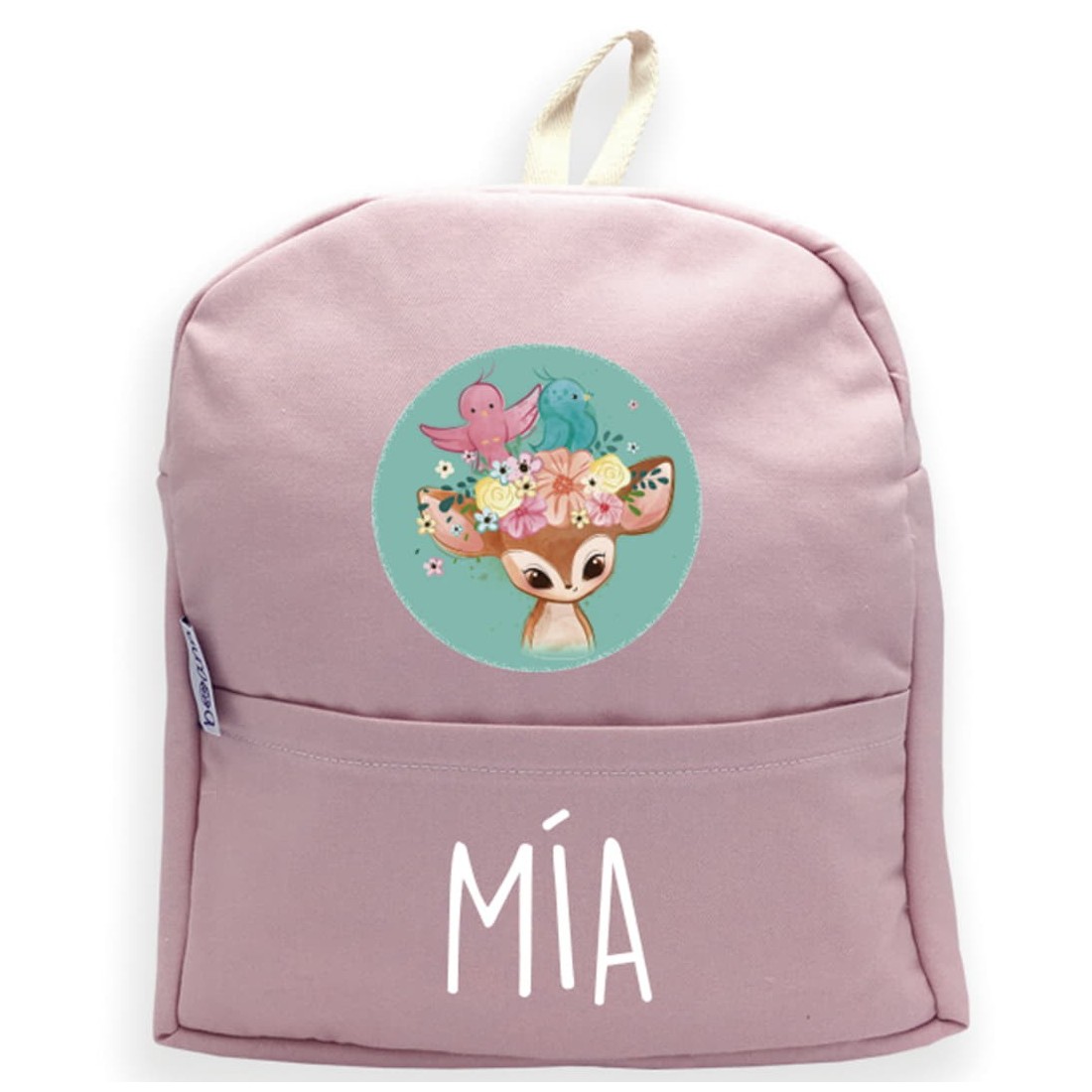 Zaino con manico e dorso personalizzato con il nome che più ti piace e disegno Bambi, disponibile nei colori rosa e blu.