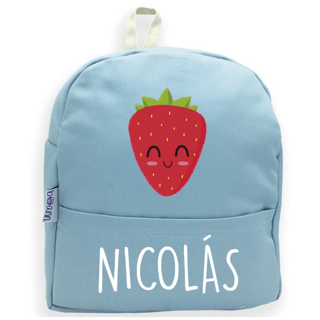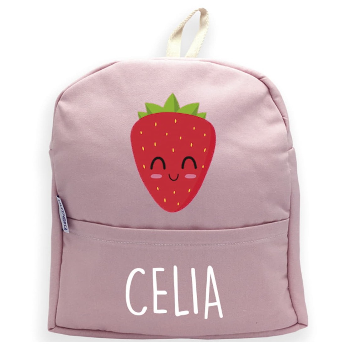 Zaino con manico e dorso personalizzato con il nome che più ti piace e il disegno Fragola, disponibile nei colori rosa e blu.