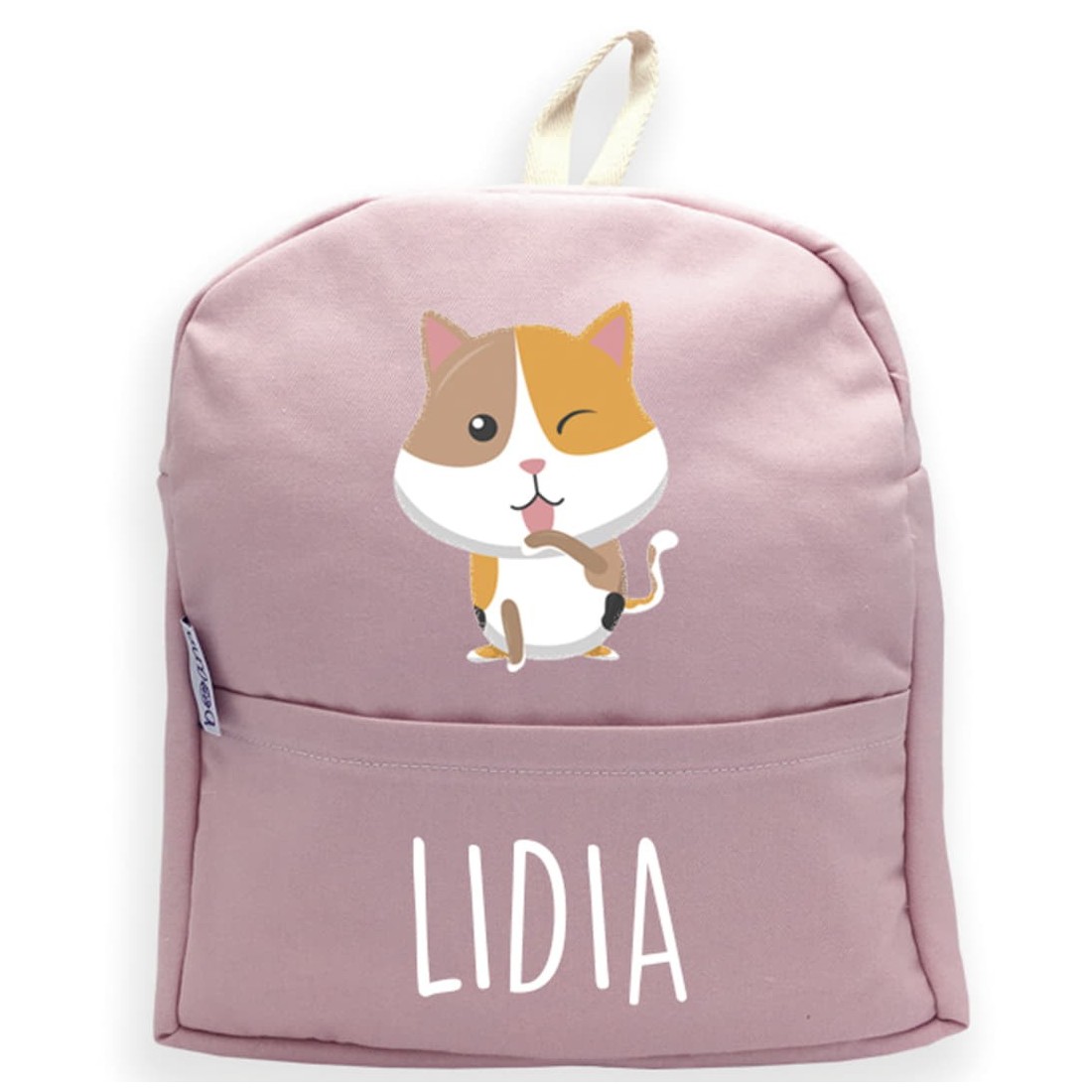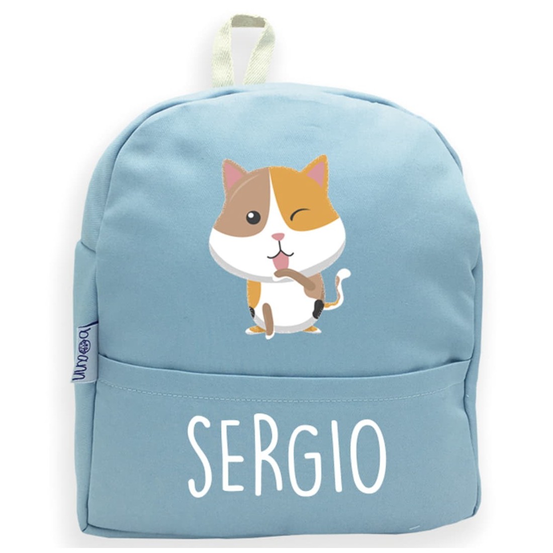 Zaino con manico e dorso personalizzato con il nome che più ti piace e il disegno di Cat, disponibile nei colori rosa e blu.