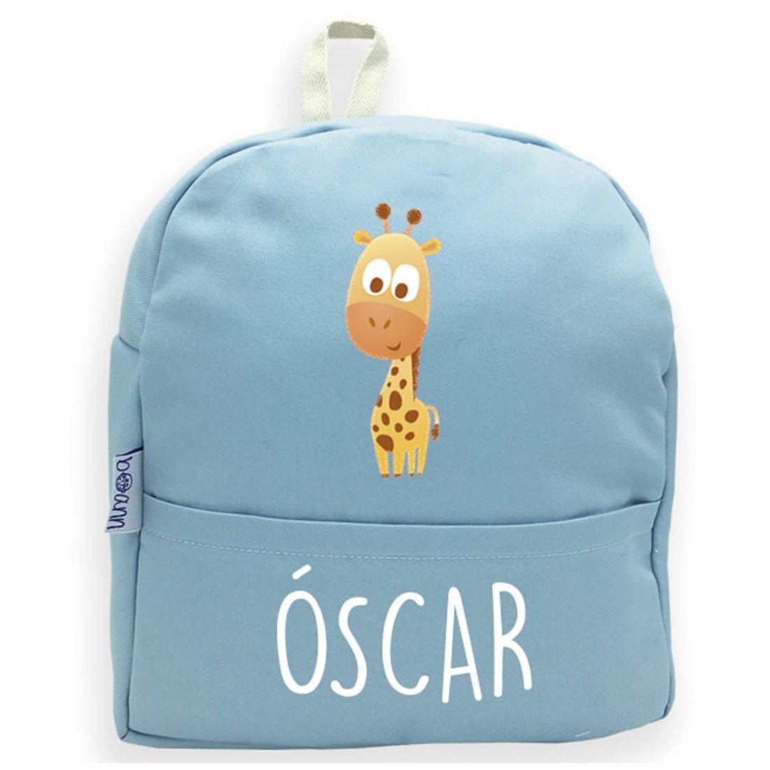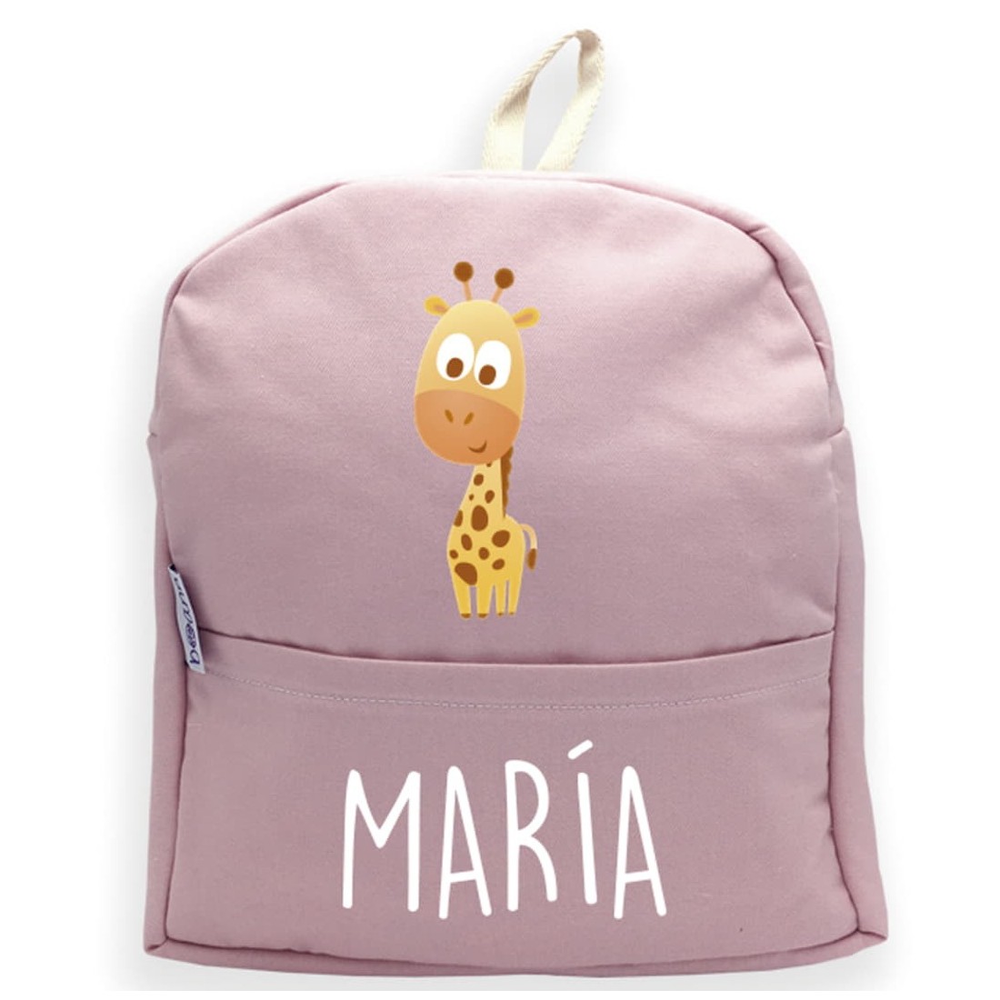 Zaino con manico e dorso personalizzato con il nome che più ti piace e il disegno della giraffa, disponibile nei colori rosa e blu.