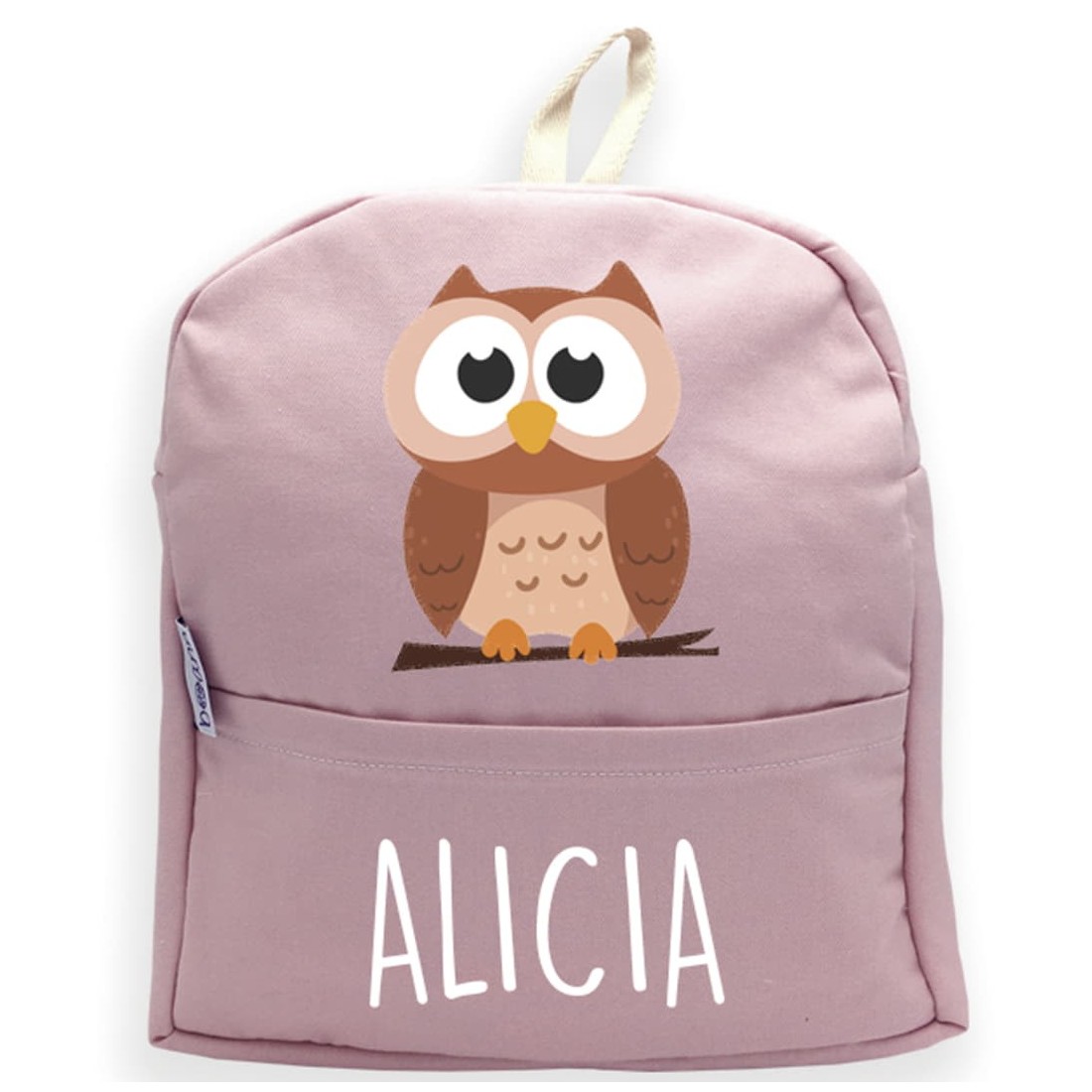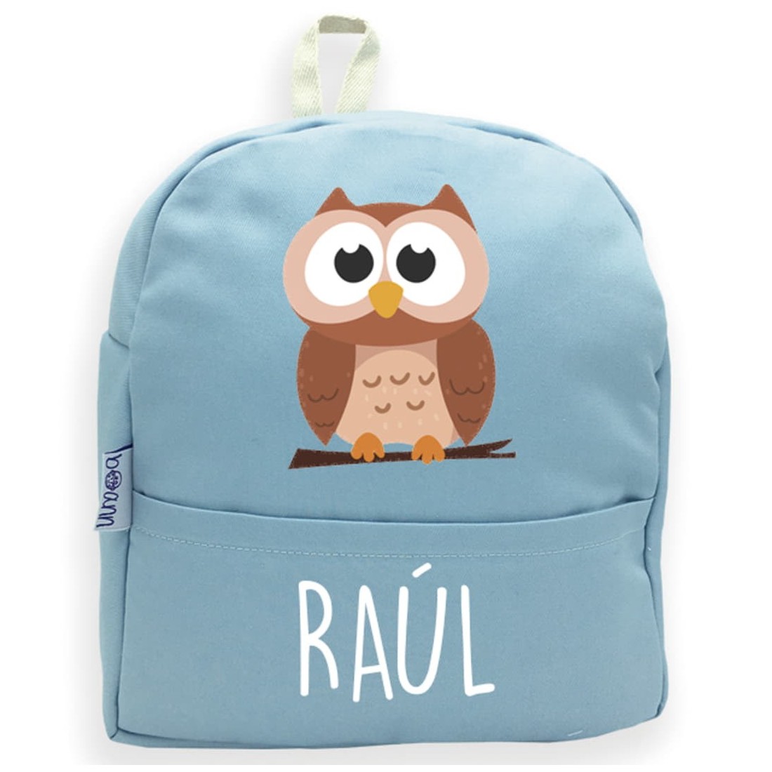 Zaino con manico e dorso personalizzato con il nome che più ti piace e un disegno del Gufo, disponibile nei colori rosa e blu.