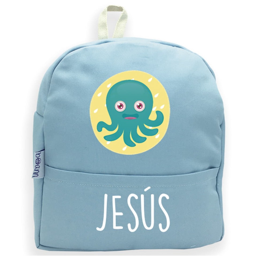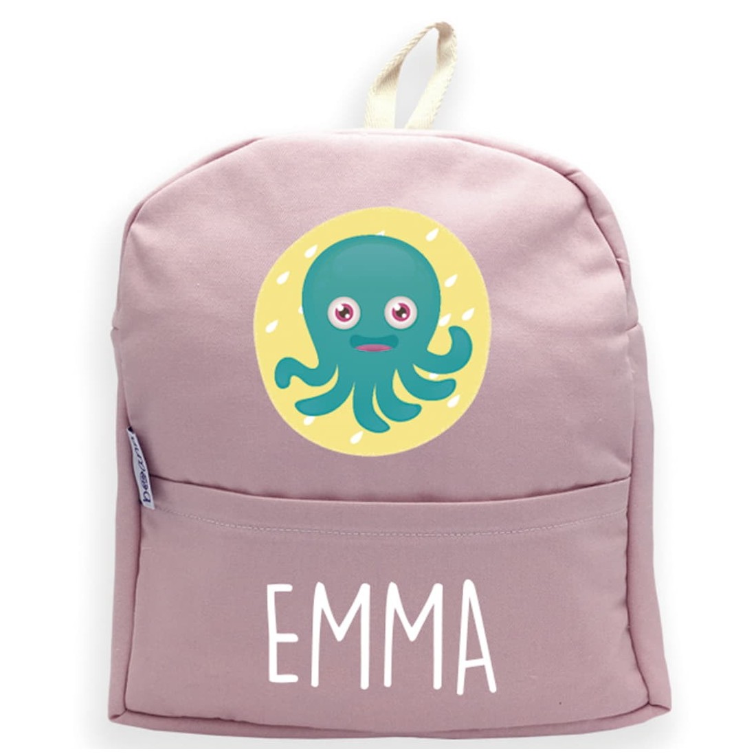 Zaino con manico e dorso personalizzato con il nome che più ti piace e un disegno Octopus, disponibile nei colori rosa e blu.