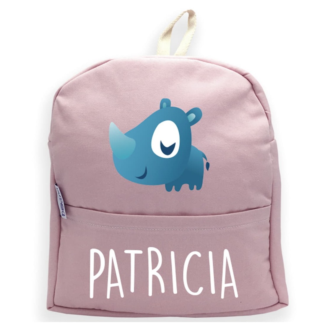 Zaino con manico e dorso personalizzato con il nome che più ti piace e un disegno di Rinoceronte, disponibile in rosa e blu.