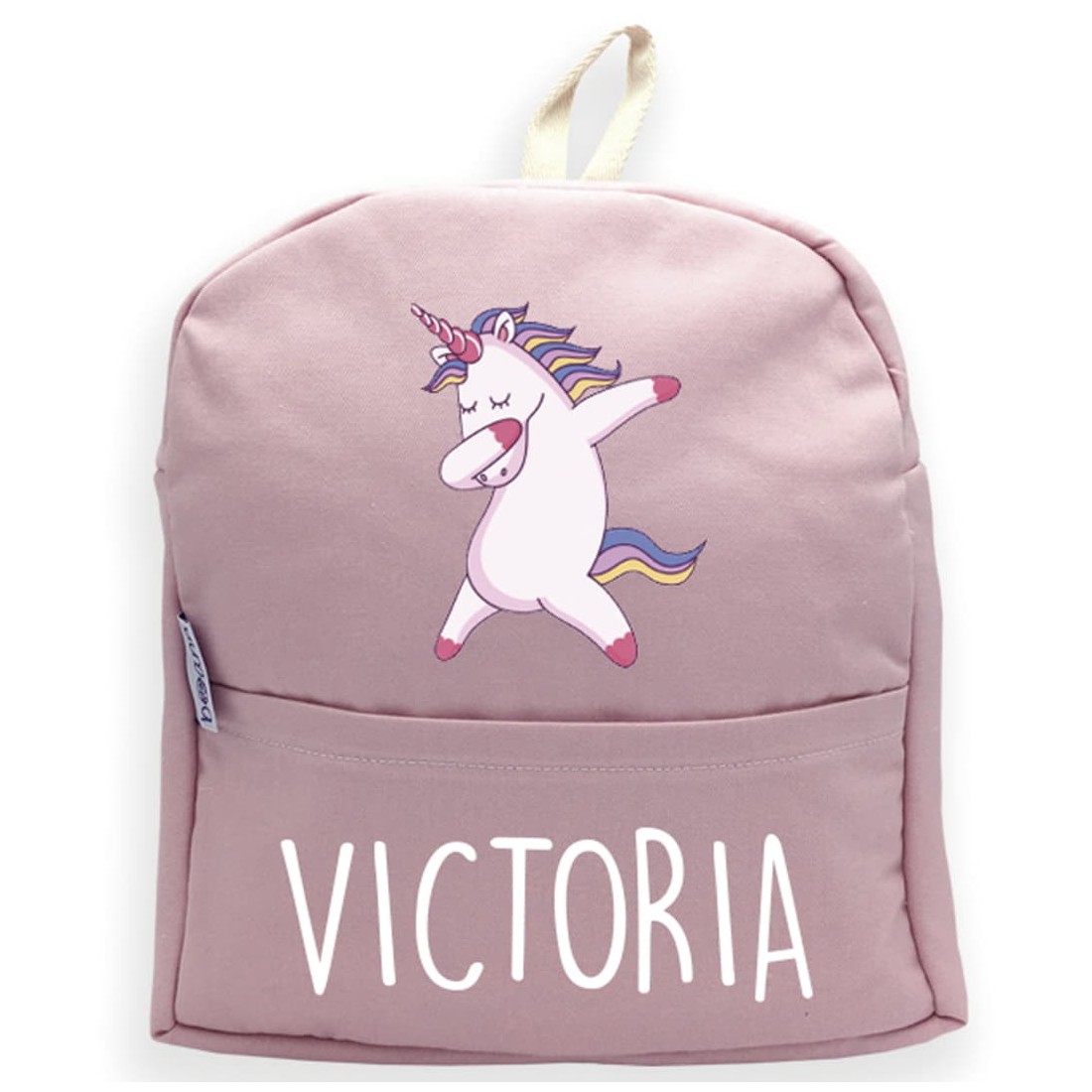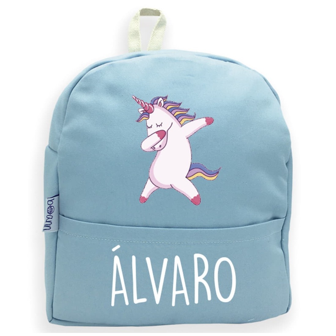Zaino con manico e dorso personalizzato con il nome che più ti piace e un disegno Unicorno, disponibile nei colori rosa e blu.